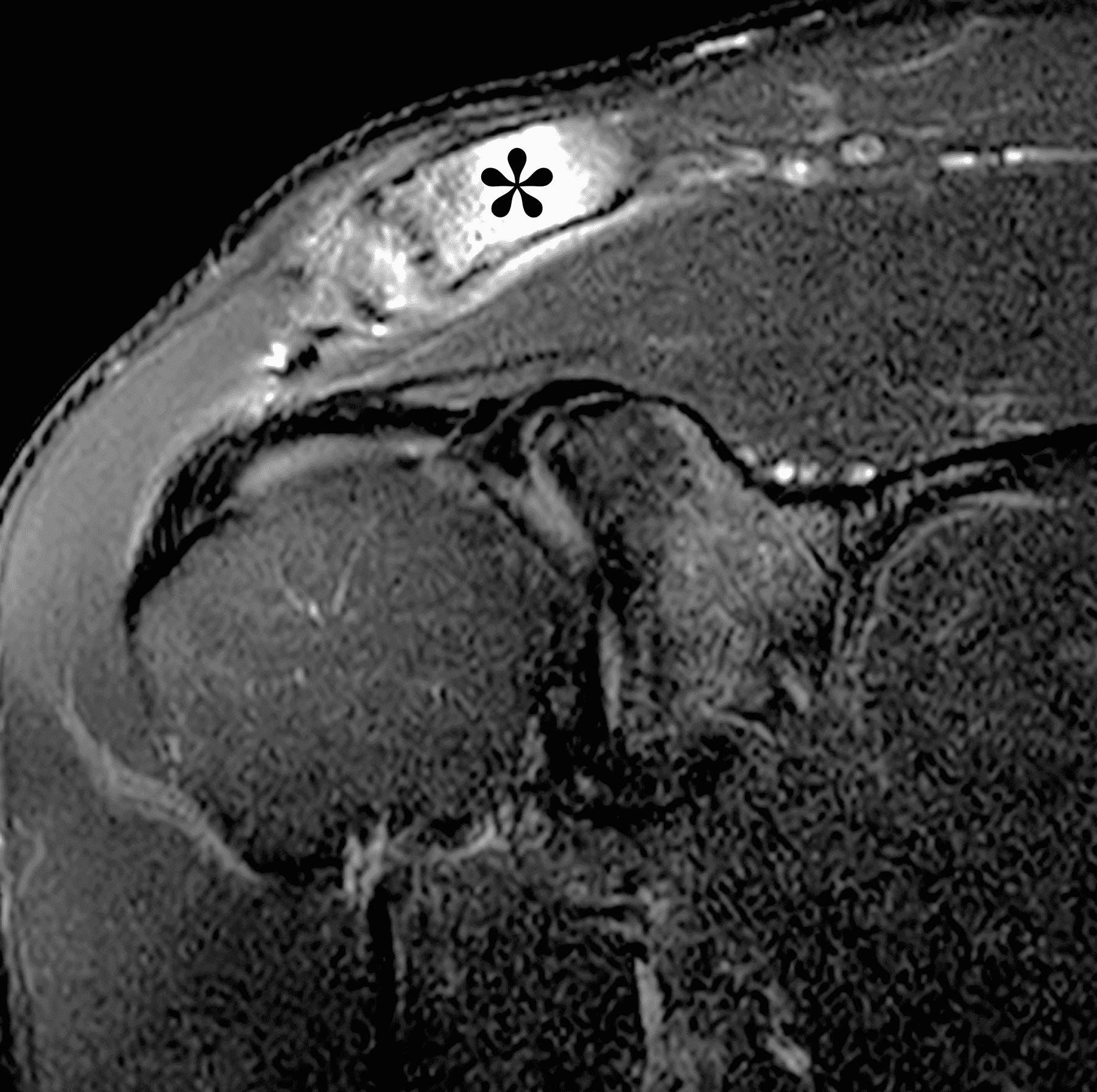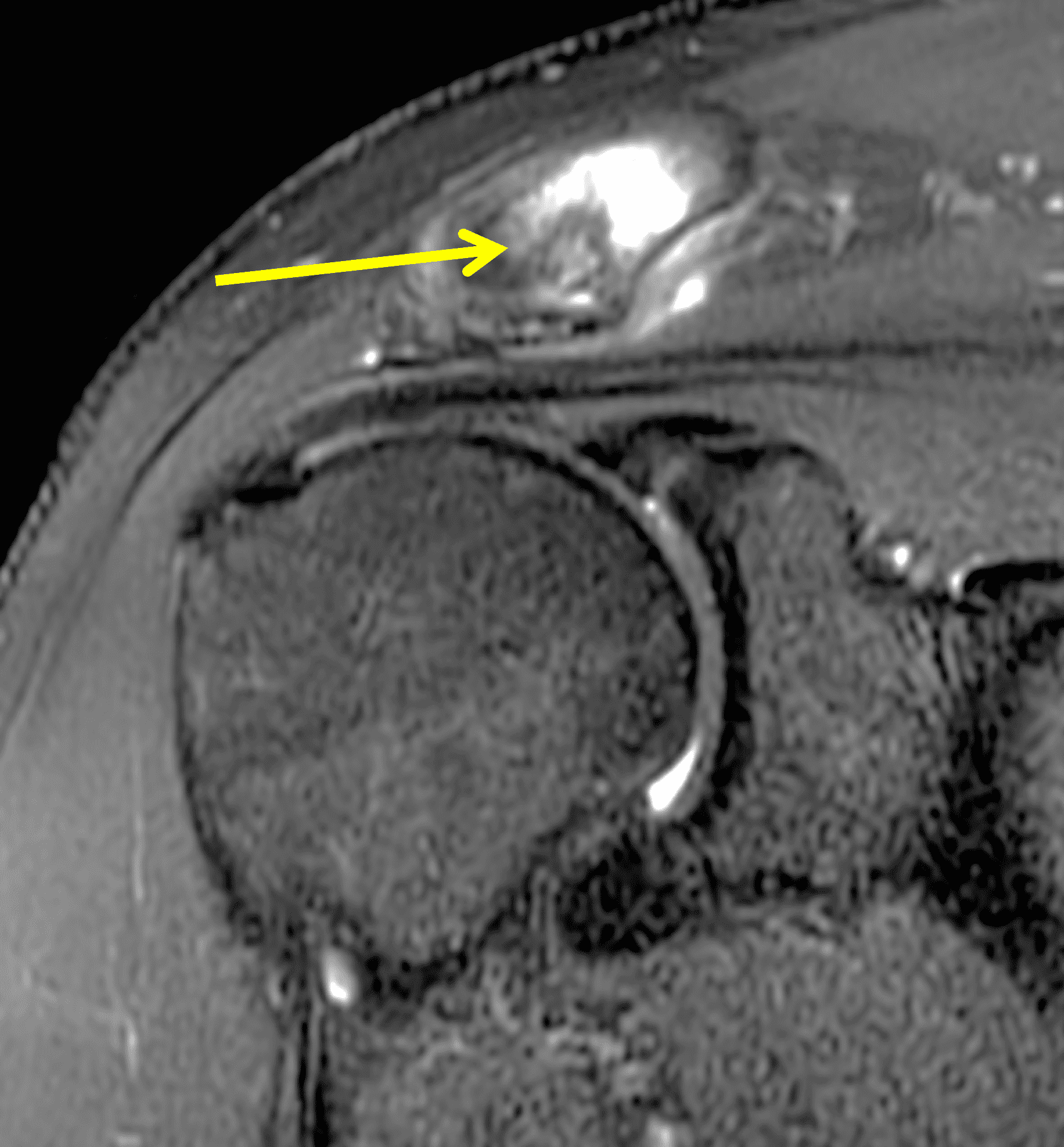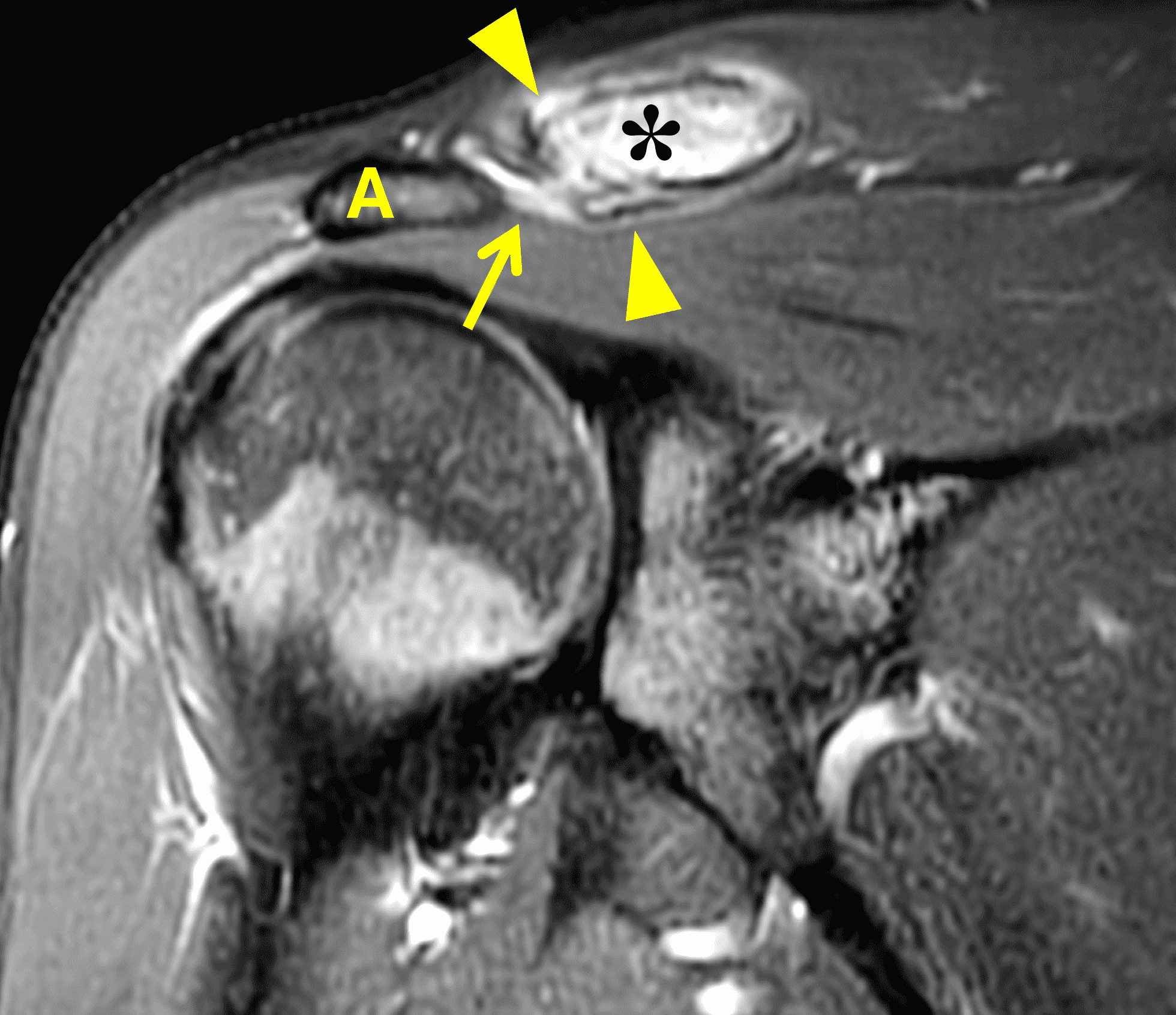 Rheumatoid arthritis (RA) is a systemic inflammatory disease primarily targeting synovial-lined structures, including the acromioclavicular joint. In most joints, the imaging findings are characterized by uniform joint space loss, marginal erosions, synovitis, and joint distension. However, in the AC joint bone destruction and erosions, which are often visible radiographically, may produce an appearance of apparent joint widening that can mimic DCO.14 On MRI, the inflammatory changes in RA (such as marrow edema or “osteitis”) typically involve both sides of the joint equally and are usually clearly centered at the joint space.15 This is also true in cases of septic arthritis. Septic arthritis characteristically progresses much faster than the other items on this differential diagnosis. In septic arthritis, extensive surrounding soft tissue inflammation and contrast enhancement of thickened synovium in the AC joint and subacromial bursa are often clues to the diagnosis (Figure 10).16 In equivocal cases, joint aspiration should be diagnostic.