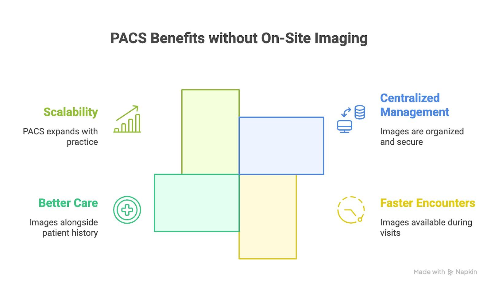 PACS systems are often marketed alongside on-site imaging equipment, but their utility extends far beyond image capture. Even without modalities in-house, many practices: