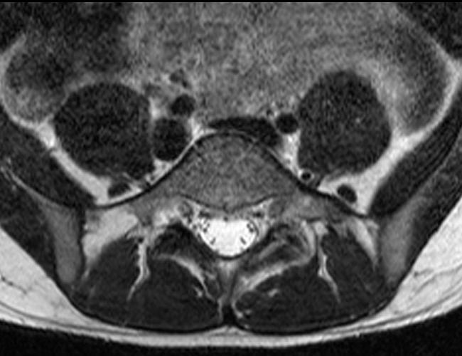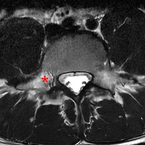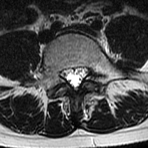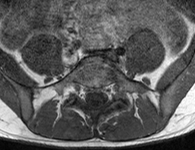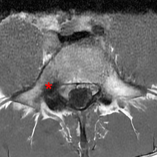 Case 2: 19-year-old male baseball player with acute onset of back pain after hitting a ball. Axial T1-weighted (2A) and T2-weighted (2B) images are provided. What are the findings? What is your diagnosis?