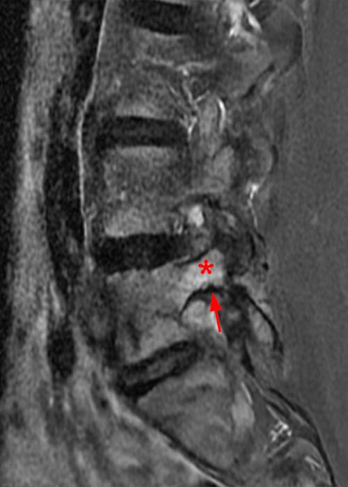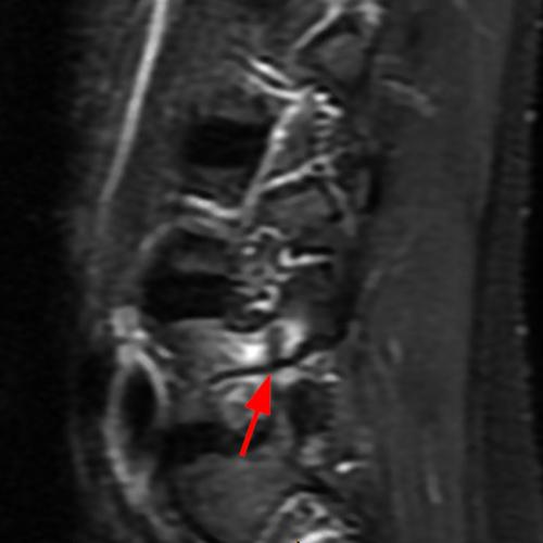 MRI is indicated in patients who have back pain and negative plain films, but a high degree of clinical suspicion for spondylolysis. MRI is the modality of choice for evaluation of acute to subacute pediculolysis or laminolysis due to its ability to detect cortical edema. In acute pediculolysis, linear T1/T2 hypointensity is commonly seen beginning at the inferior margin of the pedicle, with adjacent T1 hypointensity and T2/STIR hyperintensity due to cortical edema (Figure 8). Over time, the defect can heal with osseous bridging, or progress to a chronic defect, with development of sclerotic, T1/T2 hypointense margins and resolution of cortical edema (Figure 9).