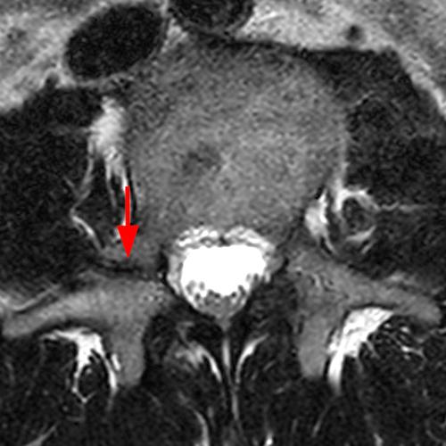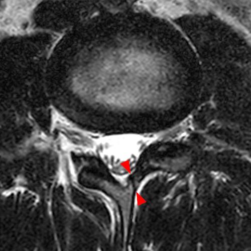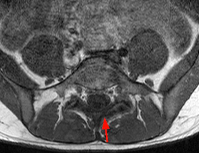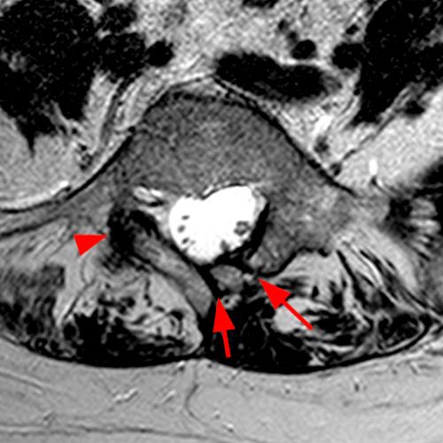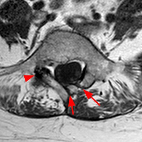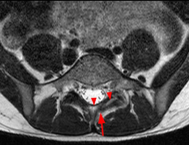 Figure 6: 55-year-old female with lower back pain. Axial T1-weighted (6A) and T2-weighted (6B) images show chronic left-sided paraspinous (short arrow) and laminar (arrow) clefts and a chronic right-sided isthmic defect (arrowheads) at L5.