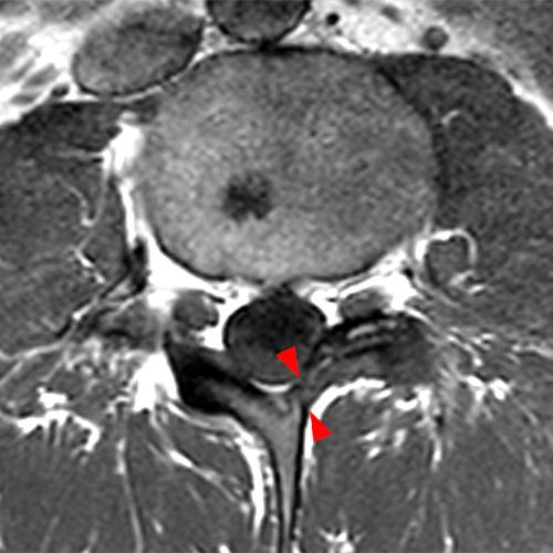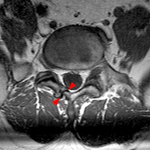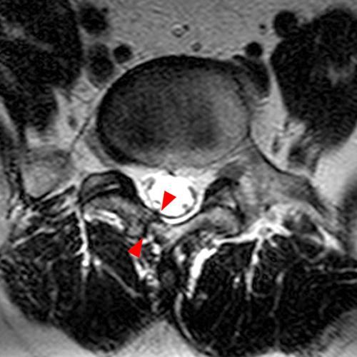 Case 2: T1-weighted (4A) and T2-weighted (4B) axial images show T1 hypointensity and T2 hyperintensity (arrowheads) in the left lamina of L5 adjacent to a small hypointense line (arrows) which traverses the lamina.