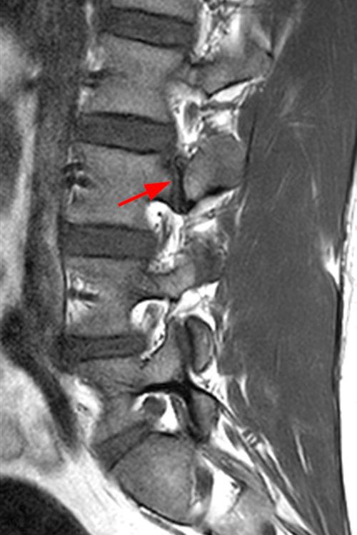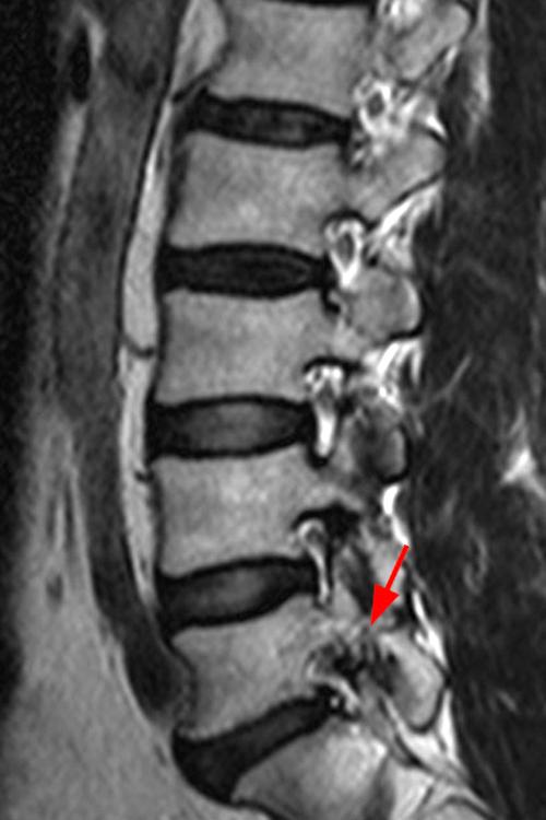 Young patients with pediculolysis and laminolysis demonstrating T2 hyperintensity on MRI respond well when treated conservatively with bracing, rest, and abstinence from sports. In laminolysis, reduction of extension loading is specifically indicated. A trial of 3-6 months of conservative treatment is generally recommended before surgical intervention is considered.12,13 Surgical repair of symptomatic chronic defects, especially those with associated instability, may involve direct repair of the defect with compression screws, and/or lumbar fusion.14,15 The age and activity level of the patient are also taken into consideration; most defects in the elderly are treated conservatively, frequently including the use of medications that treat osteoporosis.