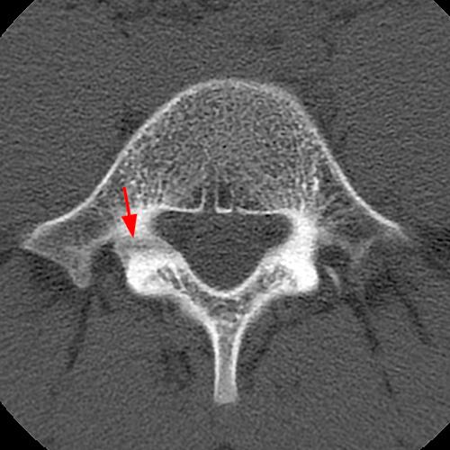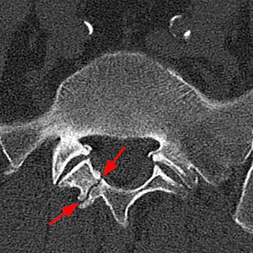 CT is not a first line imaging modality for diagnosis of acute pediculolysis or laminolysis due to its inability to demonstrate cortical edema but is an excellent modality for evaluation of chronic defects, which appear on CT as a well-circumscribed lucent line with sclerotic margins that traverses the pedicle or lamina (Figure 9). Bony hypertrophy can also be seen (Figure 10).
